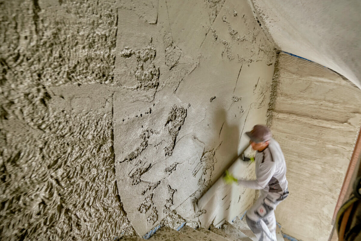 Rupp und akurit gingen als eingespieltes Team stufenweise vor. Zunächst wurden die wellenförmigen Betonwände mit der Haftbrücke MH grau von akurit belegt, anschließend kam der KIP-it. leicht als Grundputz zum Einsatz. Um die Wellenform der Betonwand auszugleichen und glatte Innenwandoberflächen zu erhalten, wurde der KIP-it. leicht in einer Schichtstärke von 10 bis 40 mm aufgetragen.