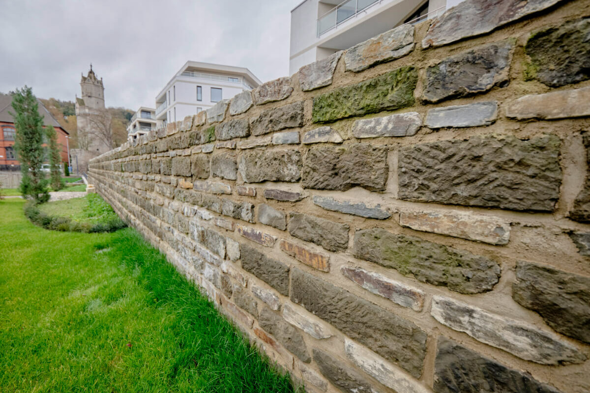 Zu den jetzt neu erstellten Gebäuden grenzt sich der „Historische Garten“ durch eine komplett neue Nachbildung der Stadtmauer ab. Diese wird von den Trass-Werksteinmörteln TWM M2,5 und TWM-s M10 von tubag zusammengehalten. Beide Mörtel eignen sich besonders gut für das Vermauern, Verlegen und Verfugen von Natursteinen. Für die Mauerkrone wurde dabei der TWM-s M10 verwendet, da dieser besonders wasserabweisend ist und sich daher ideal für Flächen eignet, die starker Bewitterung ausgesetzt sind. Um den Haftverbund zwischen Steinen und Mörtel zu optimieren, setzte das beauftragte Garten- und Landschaftsbauunternehmen bei der Mauerkrone zusätzlich die TNH-flex Trass-Naturstein-Haftschlämme ein.