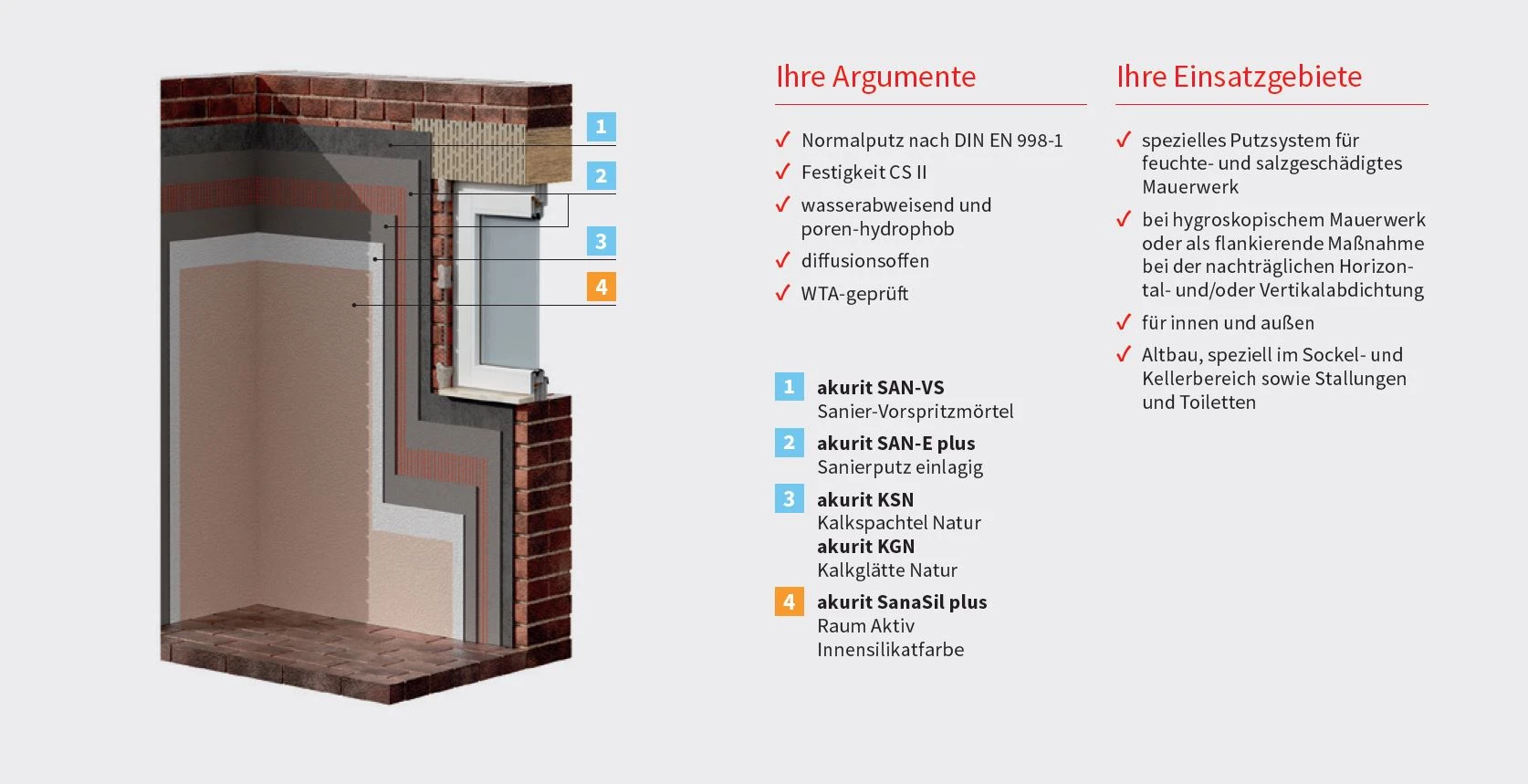 Wirkungsvoll, effektiv, zertifiziert. Wenn neben den optischen Beeinträchtigungen an alten Fassaden auch noch salzbelastete und feuchte Schädigungen zu beobachten sind, dann schafft das akurit SP Sanierputzsystem Abhilfe. Das Wirkungsprinzip funktioniert hier im weitesten Sinne durch eine gezielte Kapillarität und eine hohe Wasserdampfdiffusion. Das System ist außerdem WTA-geprüft.